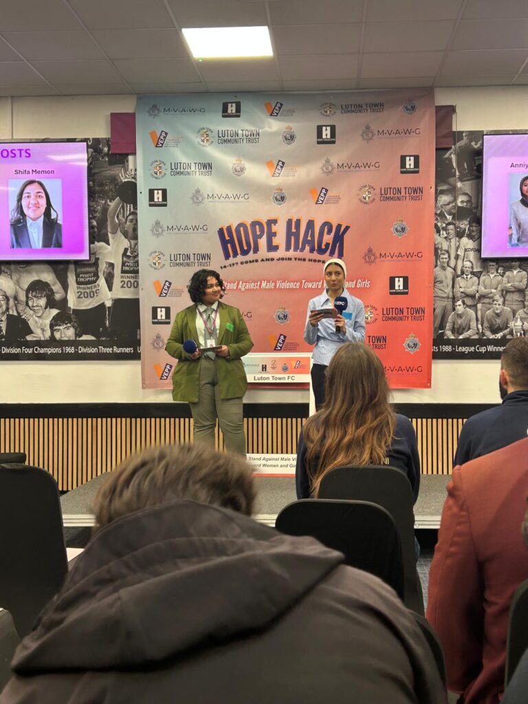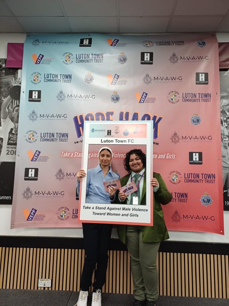 The Youth Councillors Shifa and Anniyah hosted the Hope Hack Event at Luton Town Football club, talking about the need to end Violence against women and girls.